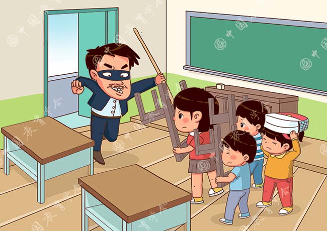 如果教室有歹徒冲进来,要第一时间站起来,然后举起椅子,用椅背挡在前面护着身体,再躲到老师的背后。如果身边没有椅子,可以用书包护着头部。