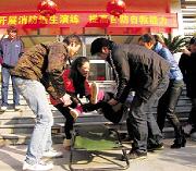 当时,报告厅里共有师生600多人。在老师的引导下,所有学生全都弯着腰,用湿毛巾捂住自己的嘴巴和鼻子,沿着不同出入口逃出报告厅。整个过程中,所有人都井然有序,没有一个学生慌得找不着北乱闯。为了能够真实模拟出火灾时的混乱场面。在演习中,还有一位同学扮演在紧急疏散中摔伤了腿。学校校医和老师需要把他抬上担架,并且进行简单包扎。“我们预计了所有可能发生的事故。所以还准备了医疗救护。”魏强说。