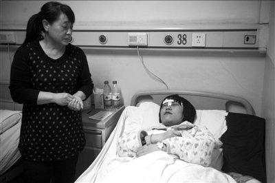 一名在该事故中受伤的县一中学生正在接受治疗,其母亲陪在一旁。
