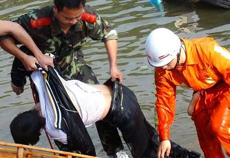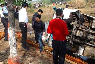 2011年4月28日6时35分左右,安徽桐城,一辆由安徽枞阳开往桐城的客车行至桐枞公路9公里处翻入路边水塘。经警方确认,事故已造成7名车上乘客死亡,另有10人被送往医院检查治疗。图为救援现场。——来源《中国新闻网》