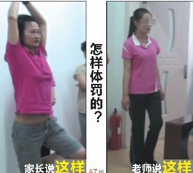 再做“游戏”,这次孩子让她做的动作是“金鸡独立”,双手举过头顶,一条腿向后抬着。曹女士告诉记者,孩子还告诉她,受惩罚期间,不能吃饭、喝水、上厕所。她想找孩子老师理论,孩子却哭着说:你别找,你要是去了,我又要挨罚了!