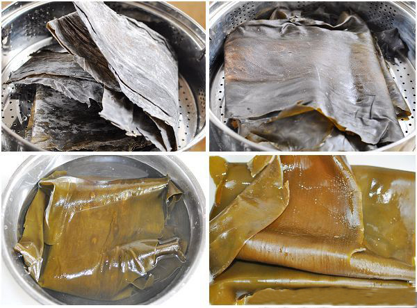 方法二:把成团的干海带打开放在笼屉里隔水干蒸半小时左右,然后用清水浸泡一夜。