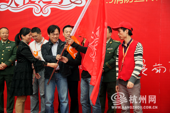 “最美妈妈”吴菊萍向“天使之手”消防志愿者服务队代表献旗