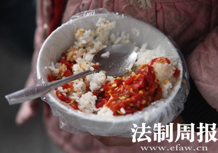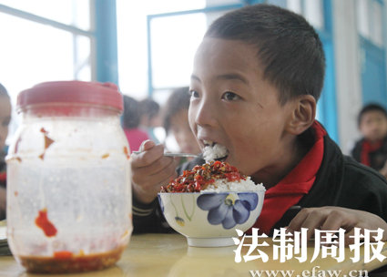 凤凰县山江镇完小四年级的吴彬每周带一罐辣椒酱,到周末正好吃完。让他兴奋的是周末回家能吃到肉了。