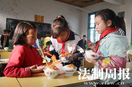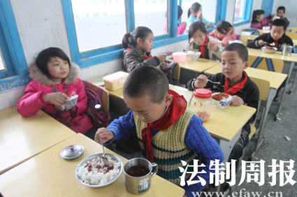 2011年10月26日,国务院常务会议决定启动实施农村义务教育学生营养改善计划,其首要措施是:中央财政按照每生每天3元的标准,为试点地区农村义务教育阶段学生提供营养膳食补助。我们希望湘西贫困山区的学生能早日享受到这份关爱,告别“罐头菜”。                     ----来源《法制周报》