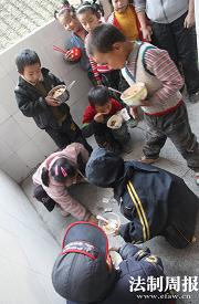 五年级学生吴送金的家离学校有近十公里。每周日,他从家里带一罐辣椒酱来学校,每餐弄几小勺,这样正好吃一周。每逢周末最让他高兴,因为回家有肉有青菜吃。二年级8岁的龙友却觉得吃辣椒酱挺好,学校里这么多人一起吃比家里有味些,在家里,只有外公外婆陪他,父母都在浙江打工。