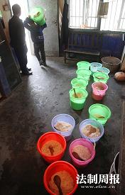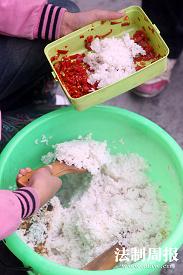吃饭铃响后,一群小学生飞奔去了食堂,把装有米饭的塑料桶抬到教室,学生们排队盛饭,之后纷纷从课桌里拿出他们的“罐头菜”来拌饭吃,尽管这些“罐头菜”大多是一些简单的辣椒酱及咸菜,但这并不影响他们的食欲。