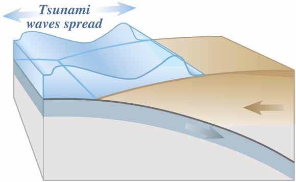 沿海地区以及海底发生强烈构造的地震时,海底地形急剧上升变动引起海水强烈扰动,导致巨大的灾难性波浪形成可怕的地震海啸。据统计,大约95%的海啸都是因为海底地震引发的。酿成了巨大的灾难。海底地震发生时,底层发生断裂,部分地层出现猛然上升或者下沉,由此造成从海底到海面的整个水体发生剧烈的颤簸,震荡波在海面上以不断扩大的圆圈,传播到很远的距离而引发了海啸。