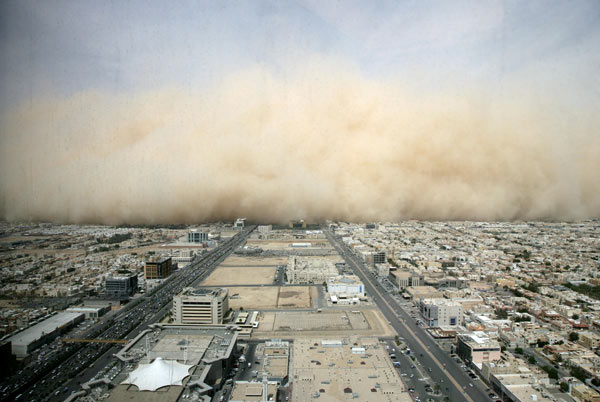 沙尘暴是沙暴和尘暴两者兼有的总称,是指强风把地面大量沙尘物质吹起卷入空中,使空气特别浑浊,水平能见度小于1千米的严重风沙天气现象。其中沙暴是指大风把大量沙粒吹入近地层所形成的挟沙风暴;尘暴是指大风把大量尘埃及其他细粒物质卷入高空所形成的风暴。