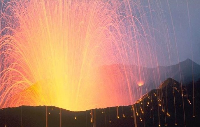(3)中间式: 属于宁静式和爆烈式喷发之间的过渡型.此种类型以中基性熔岩喷发为主。若有爆炸时爆炸力也不大。可以连续几个月,甚至几年,长期平稳地喷发,并以伴有歇间性的爆发为特征。以靠近意大利西海岸利帕里群岛上的斯特朗博得火山为代表.该火山大约每隔2-3分钟喷发一次,夜间在50公里以外仍可见火山喷发的光焰,故而被誉为“地中海灯塔”。又称斯特朗博利式。有人认为我国黑龙江省的五大连池火山属于这种类型。