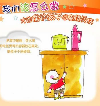 1. 把家中暖瓶,饮水器和电饭煲等热容器放在高处,使孩子不易碰到。