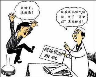 从受到艾滋病病毒感染, 到体内产生出艾滋病病毒抗体,这一段时间称为窗口期。在窗口期,艾滋病病毒感染者的血液检测查不到艾滋病病毒抗体,结果呈阴性。窗口期的长短个体有差异, 在2周到8周,一般为10周,只有极个别人的窗口期长达3-6个月(但这种机会万分之一都不到)。在感染过程中,首先出现的是病毒RNA,这是可以用PCR的方法检测出来,之后出现的是IgM抗体,使用双抗原夹心法即可以检测出来,然后出现的是IgG抗体,使用间接法可以检测出来,现在提供的金标试纸条是双抗原夹心法,最短在感染6天之后就可以检测出来,大多数样本的窗口期在8周内,绝大多数人在2个月后都可以检出,如果高危行为过了2个月仍无法检测出来,基本上没有感染的可能了。