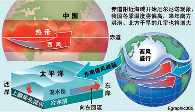 厄尔尼诺发生年的冬季,我国往往出现暖冬。相反,拉尼娜事件发生时,我国温度下降,往往出现冷冬气候。