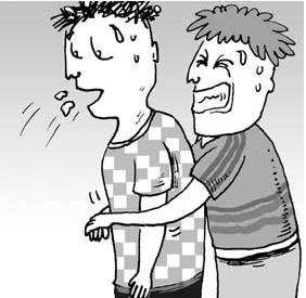 卡住嗓子不能呼吸时,要立刻把孩子倒着拎起来,猛拍背部,让其吐出来。或者双手从后搂住孩子,用力压上腹部。