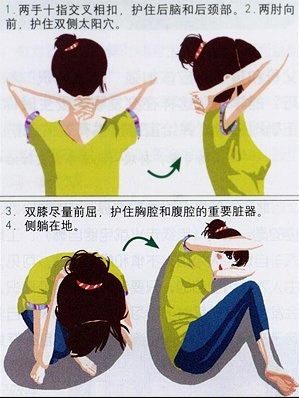 1. 两手十指交叉相扣、护住后脑和颈部;两肘向前,护住双侧太阳穴。