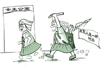 实际上,正是受害者这种软弱的态度,助长了施暴者的淫威,据调查,在一些学校里,常有个别为满足自己上网、玩游戏机和吃零食等欲望,强行向低年级的学弟、学妹索要“零花钱”的高年级学生。他们一般看准那些家庭条件比较富裕的低年级学生下手,“成功”之后,就一直盯着这些“软柿子”反复拿捏。假如碰到稍有反抗的,他们就会给他“颜色”看看,直到被欺负者顺从为止。除“零花钱”外,他们还会向学弟、学妹强行索要自己喜欢的文具、手表、自行车等物品。