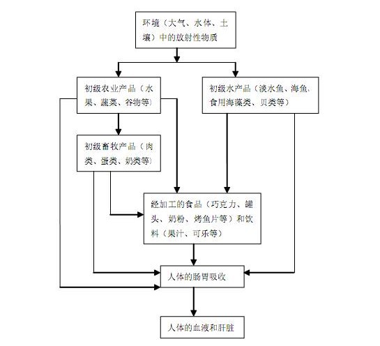 消化道食入是放射性物质进入人体的重要途径。放射性物质既能被人体直接摄入,也能通过生物体,经食物链途径进入体内,见图1。