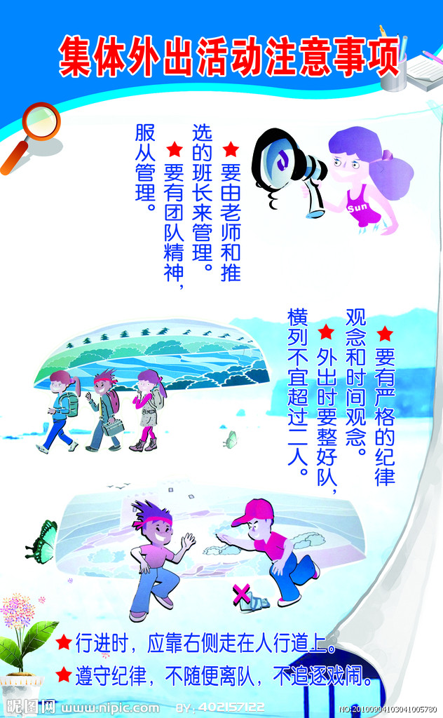 2、明确出游的目地,做好自己的计划,认真完成学校领导和老师布置的学习、考察任务。