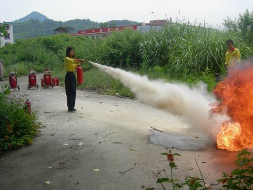5.右手抓筒耳,左手抓筒底边缘,把喷嘴朝向燃烧区,站在离火源八米的地方喷射,并不断前进,兜围着火焰喷射,直至把火扑灭。