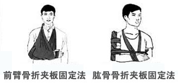 1、前臂骨折固定法:夹板放置骨折前臂外侧,骨折突出部分要加垫,然后固定腕肘两关节(腕部8字形固定),用三角巾将前臂屈曲悬胸前,再用三角巾将伤肢固定于胸廓。