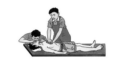 在呼吸骤停的紧急护理时,如果向病人中内吹气遇到阻力时,首先应疑及病人的气道中是否有异物存在,此时应使病人转向护理者,在其两肩胛骨之间用力拍打,以使异物移动排出。然后应对病人的口腔和其余气道进行探查是否存在异物。这里介绍一种最近普遍使用的驱除气道异物的新方法:使病人仰卧位。救护者将自已一只手放于另一只手的手背上面,然后将双手放在病人肋弓与脐之间的腹部上面,进行快速用力冲击,这样可使气道内的压力增高,从而使异物迅速排出。如果发生呕吐,应迅速清除呕吐物以防窒息。在进行上述紧急护理的同时,应赶紧让人打急救电话,叫救护车急送附近医院抢救。