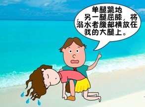 (1)救生者一腿跪地,另一腿屈膝,将溺水者腹部横放在救护者屈膝的大腿上。