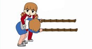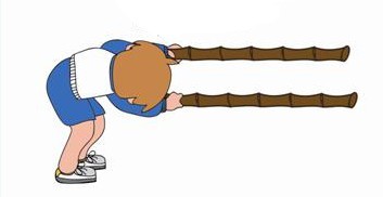 (1)双手握住两根竹竿(注意竹竿要有足够的承载能力)的一端,稍俯身向下,如果是外套,则需先将钮扣或拉链扣紧。