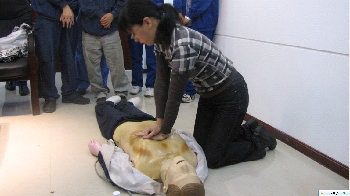 救护者跪在触电者一侧或骑跪在其腰部两侧,两手相迭,手掌根部放在伤者心窝上方、胸骨下,掌根用力垂直向下挤压,压出心脏里面的血液,挤压后迅速松开,胸部自动复原,血液充满心脏,以每分钟60次速度进行。