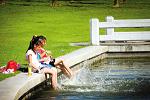 7月4日下午,两名女学生在禅城文华公园的池塘边戏水。家长应多关心孩子,让他们拥有一个健康快乐的暑期生活。