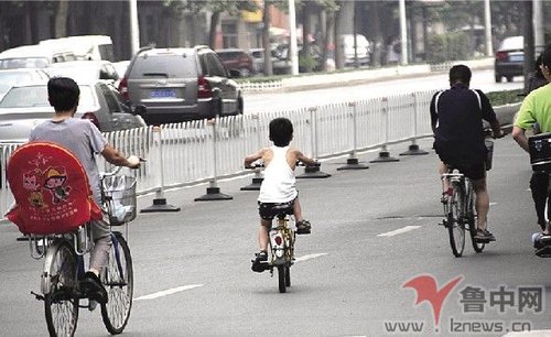 在张店区人民路与金晶大道路口,一名小朋友骑车穿梭在拥挤的马路上。