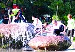 孩子们蹲在景观喷泉上玩,很容易跌下来