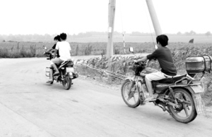 19日,记者在南塬采访,经过临渭区三张镇西洛时发现,两位穿着拖鞋的小学生骑着一辆摩托车,用细绳子绑着另一辆小学生的摩托车准备下坡。记者再三提醒他们这样不安全时,他们却一笑回答“没事。”尽管我市教育系统暑假前夕都进行了暑期安全教育,严禁未满18周岁学生骑摩托车等,可暑期孩子们的安全问题依然令人担忧。
