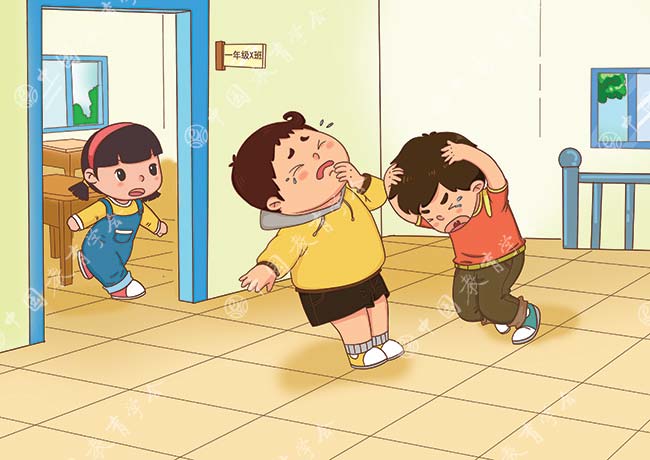 原来,欣欣追打小胖,小胖向教室外跑去,刚好撞上从教室外跑进来的亮亮。