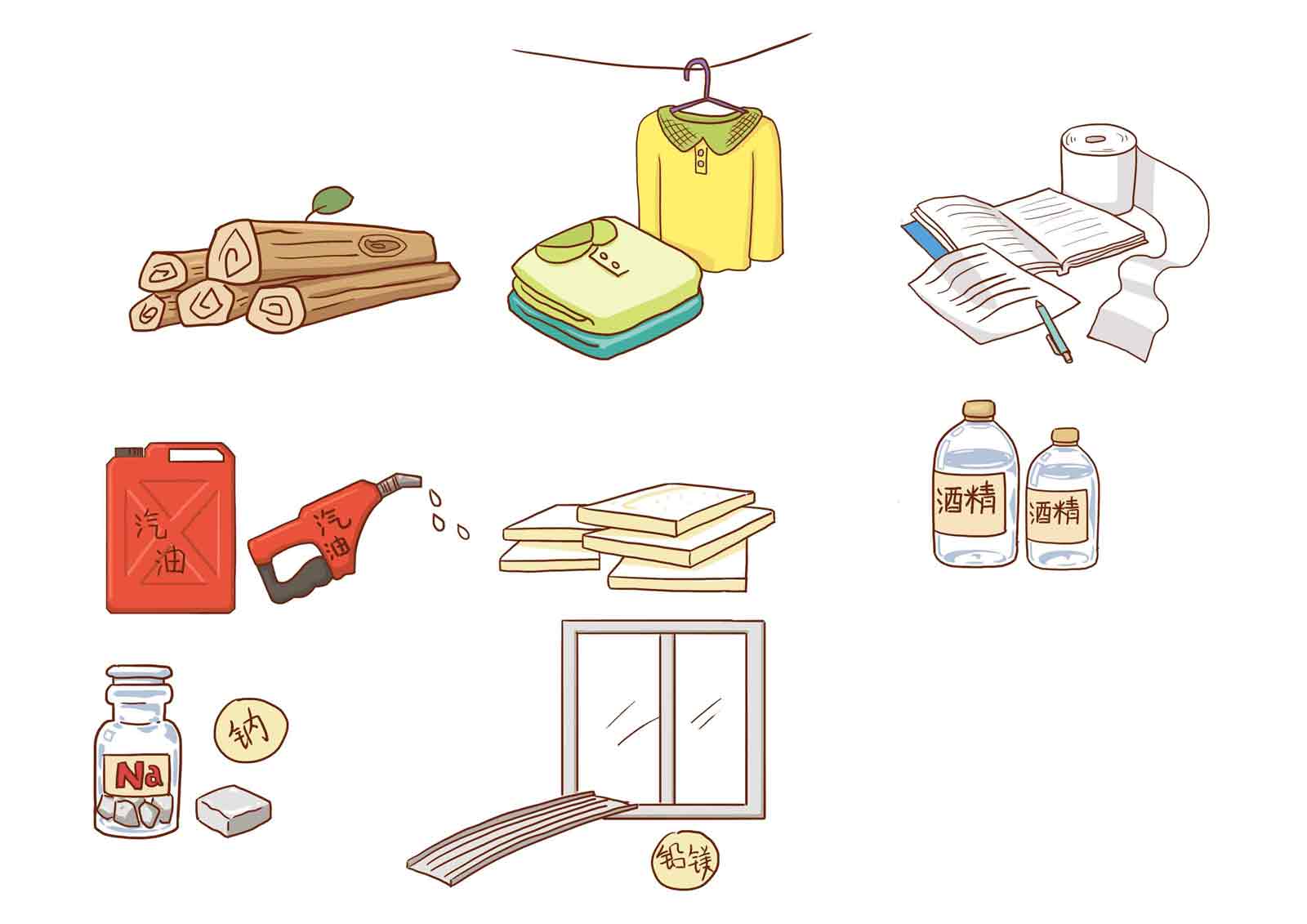 水、沙子都是常见的灭火材料,但如电、油、酒精类物品着火时不能用水扑灭,因为水会导电,而油和酒精会漂浮在水上继续燃烧。