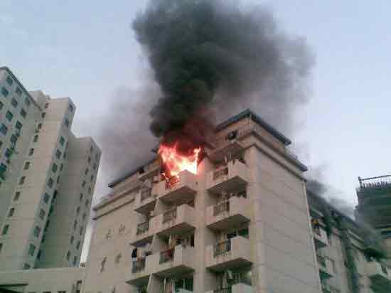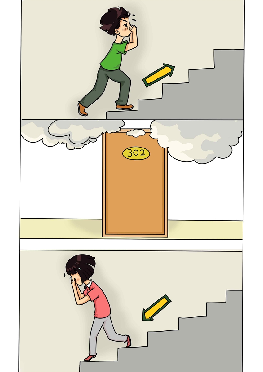其他楼层发生火灾时,如果着火点位于楼上,要向楼下逃离;如果着火点位于下层,且大火和烟雾已封锁向下逃生的通道,应尽快逃往楼顶或天台。