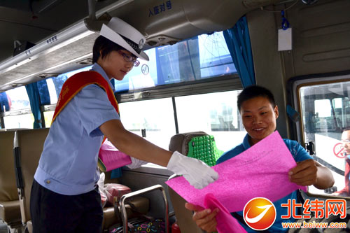 交警向驾驶员发放安全交通宣传资料