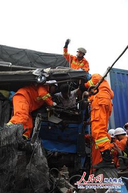 据参与现场救援人员介绍,今早6点左右,在距朱亭服务站3公里处,一辆挂车和货车发生碰撞,但由于高速上出现浓雾笼罩,能见度非常低,后来车辆来不及避让相继撞上,造成22辆汽车连环相撞。
