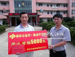 9月26日,新余市渝水区福彩办公室负责人来到该市珠珊镇中学,向22年来义务担当学生守护神的胡小剑老师(下图左一)送去公益金5000元。