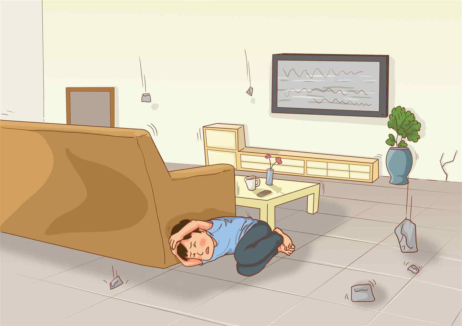 如地震发生,你正在看电视不能迅速逃离时,可靠近沙发或椅子的旁边躺下,然后蜷缩起来。