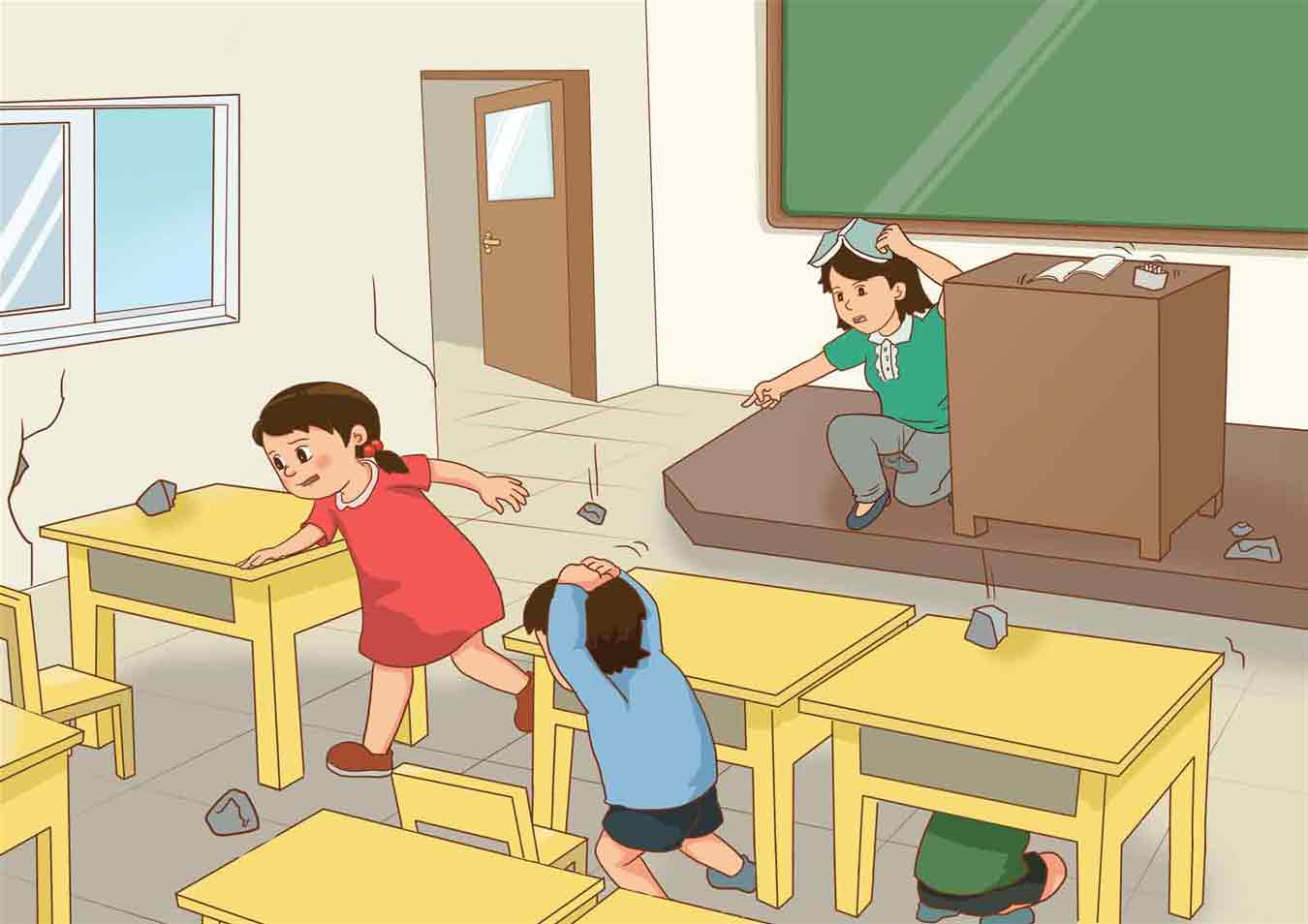 无论教室是楼房还是平房,都应迅速抱头、闭眼,在老师的指挥下,躲在各自的课桌下;