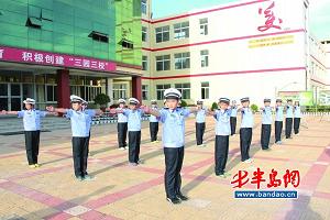 该校还协调交警大队在校园内设置了一条交通安全教育马路,让学生在这里模拟安全出行,认识各类交通标志,学习交通规则;建有一个校园交通安全文化小广场。专门制作了交通安全宣传画,通过鲜活的案例和图片讲解,增强安全教育的说服力。图为小交警们在练习交通指挥手势。