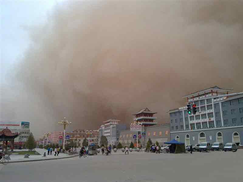2012年8月29日中午,一场突如其来的沙尘暴袭击了甘肃敦煌。瞬间天昏地暗、黄沙漫天,风力最强时能见度不足20米,过往车辆均打开大灯和警示灯,在风沙中缓慢行驶。强风持续了3个小时左右才逐渐减弱。