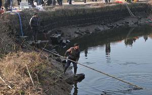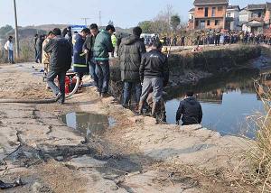 事故发生后,当地救援队员对现场水塘进行排水打捞工作,排查遗漏的伤亡人员。