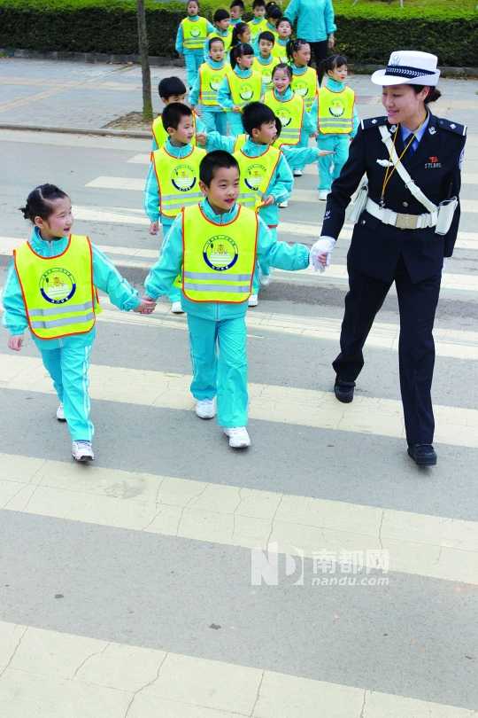 昨日上午,丰乐路少年宫,小朋友穿上荧光安全背心,在交警的带领下过马路。