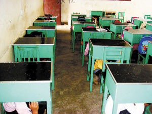 学生双手抱头就近躲避在课桌下。