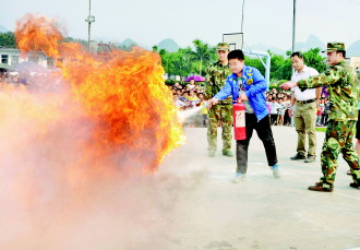 3月25日,是第18个全国中小学生安全教育日,今年的主题为“普及安全知识,确保生命安全”,各地纷纷举办形式多样的安全教育活动,让学生们从中学习安全知识,不断提高安全意识和安全防护能力。自1996年起,每年3月最后一周的星期一,被确定为全国中小学生安全教育日。图为在广西忻城县城关镇中心小学,公安消防大队官兵指导师生使用灭火器灭火。