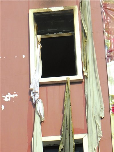 火灾大楼的窗户上有不少逃生时留下的白色窗帘。新华社发