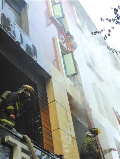 4月14日,消防人员用梯子从酒店中救人。新华社发