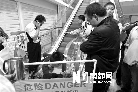 事发在东门荟国际轻纺城内4楼通往3楼的扶手电梯上。南都记者昨日下午赶到现场时,电梯已停,贴上了市场监管局的封条,并装上围挡,禁止通行,有检验部门人员在现场查看。