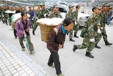 23日,宝兴县城,民众背大米回家。